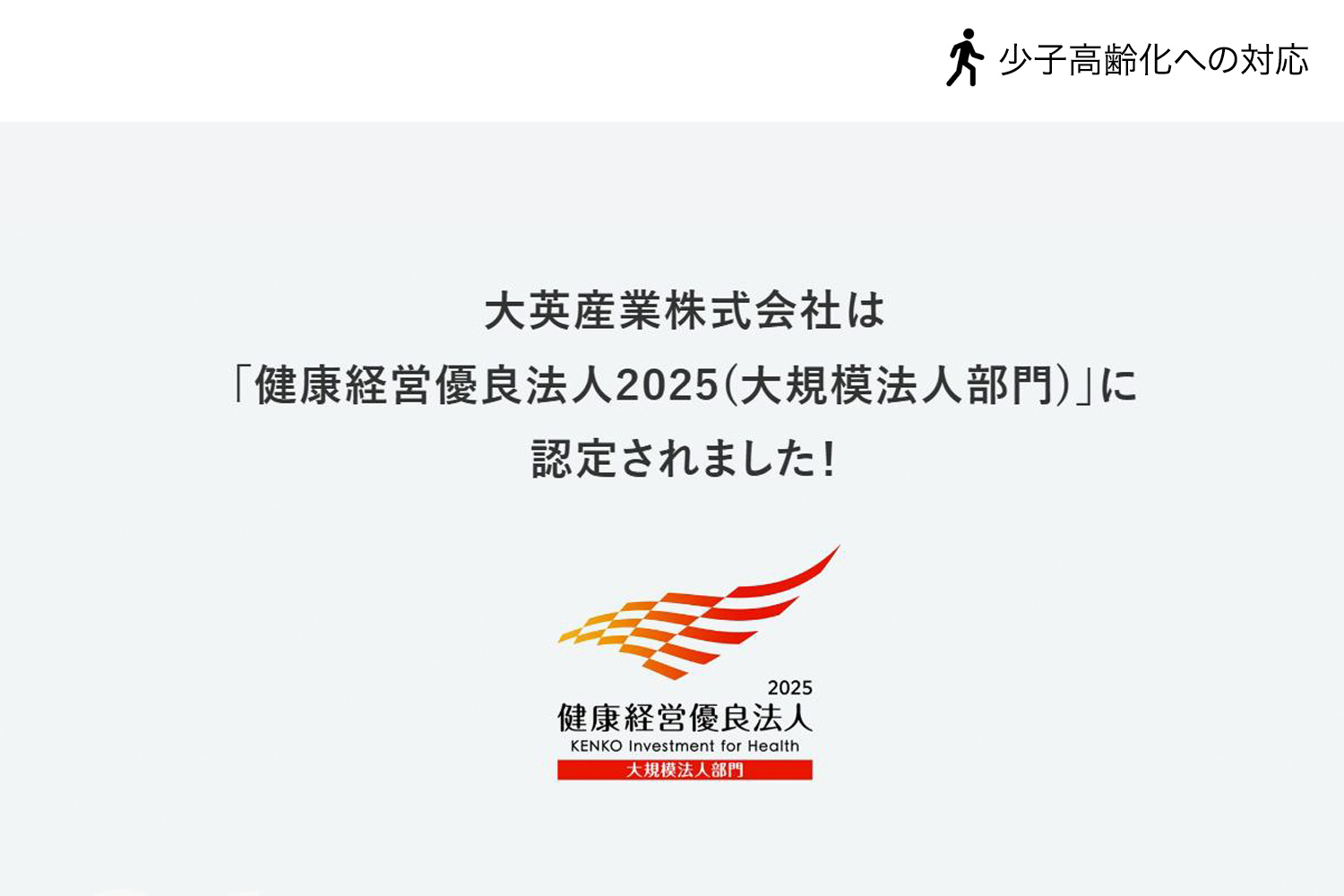 社内に向けた取組みとしては、少子高齢化による働き手不足解消に向けて、健康増進の施策、多様な働き方の制度設計により「健康経営優良法人2025の大規模法人部門」に5年連続で認定されております。