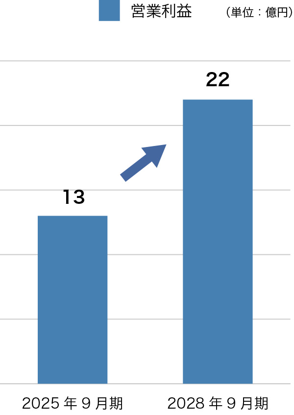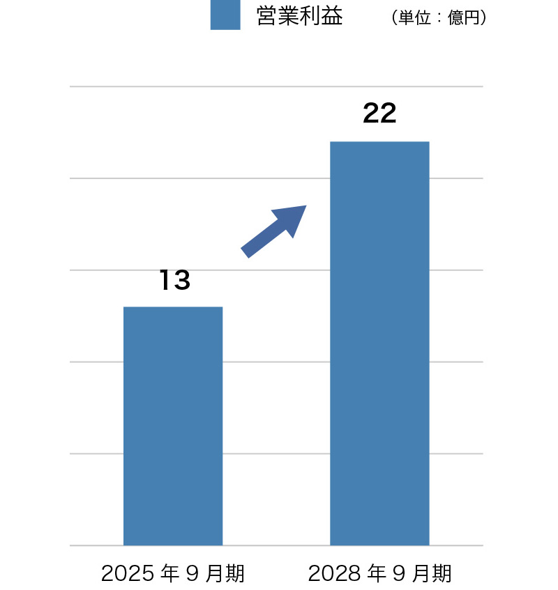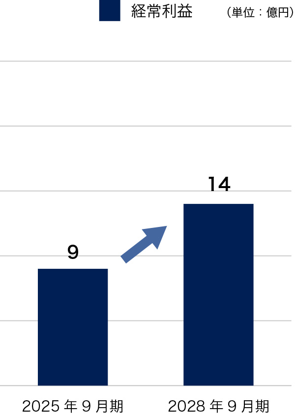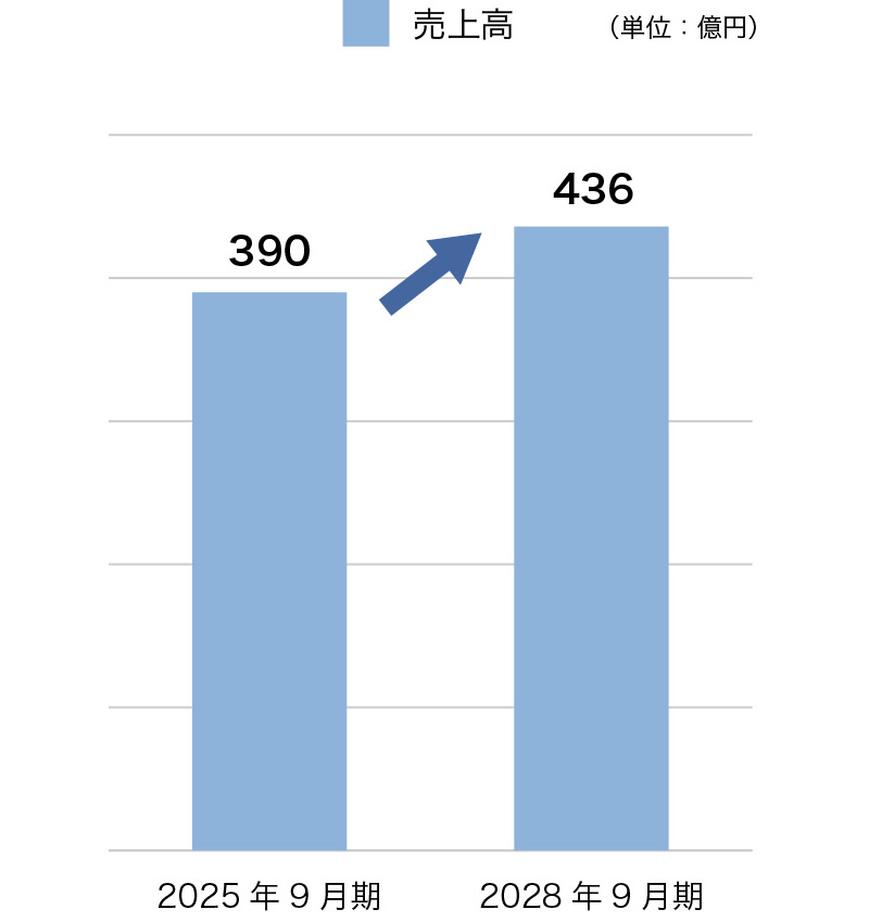 当社は、2028年9月期を最終年度とする中期業績目標を策定しています。2028年9月期には売上高436億円、営業利益22億円、経常利益14億円を目指します。これは、2025年9月期の実績と比較して、売上高で約12%増、営業利益で約69%増、経常利益で約56%増という売上よりも利益率、額を重視した成長目標となっています。