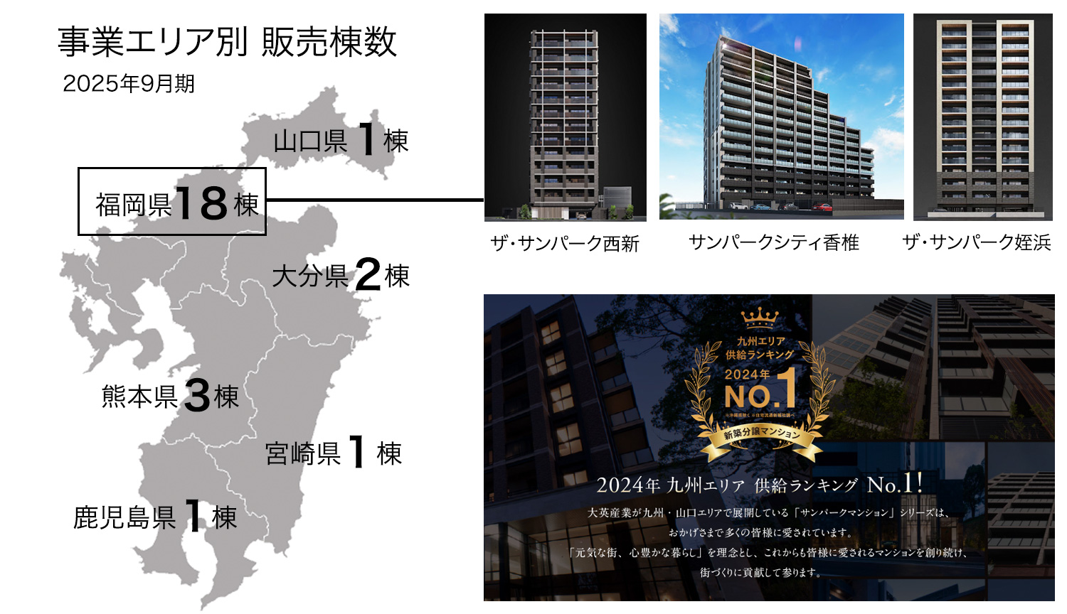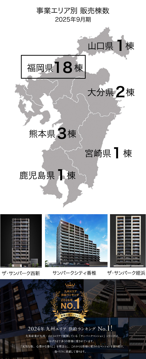 九州・山口エリアにて事業を展開しており当期に供給した26棟のうち、約7割にあたる18棟が福岡県内での供給となり、人気エリア福岡での展開が一段と増加しています。