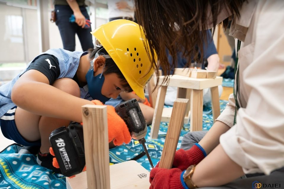 こどもたちも、初めての電動工具に苦戦しながらも