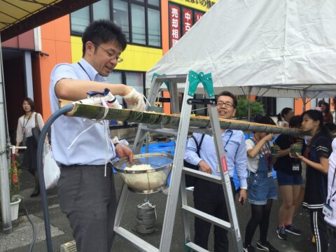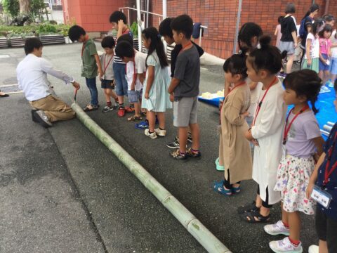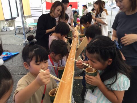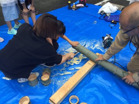 竹を切ってレーンと器を作りました。初めて工具を使って作業する子もいました。