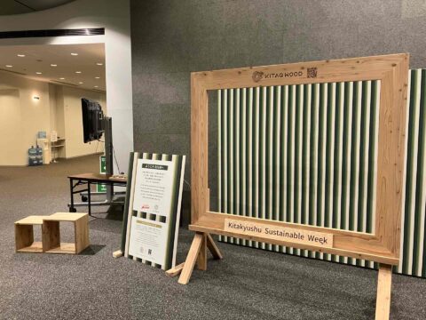 会場内では、北九州市産のブランド木材「KiTAQ WOOD」と