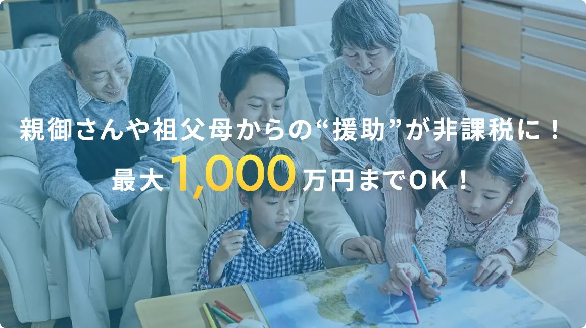また、ご両親や祖父母からの資金援助が最大1,000万円まで非課税で使える制度は、『自己資金に不安がある…』という方にも大きな助けになります。